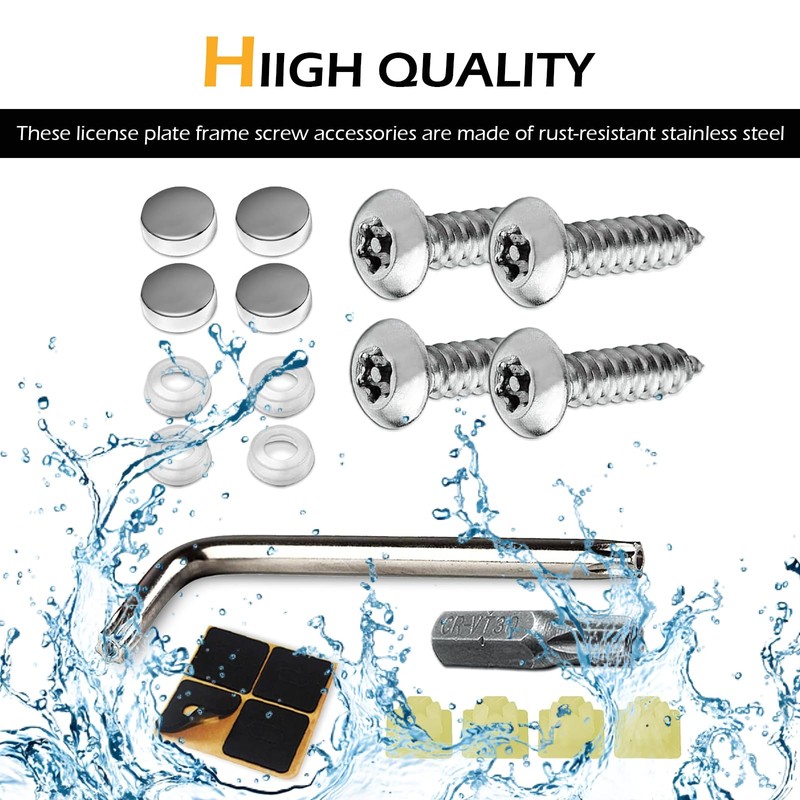 - Package Include: This license plate frame mounting kit includes 4 stainless steel screws, 4 screw washers , 4 screw caps, 4 nylon screw inserts, 4 foam pads, 2 wrenches. If you have any questions about this product of ours, please contact us in time, we will reply you within 24 hours.