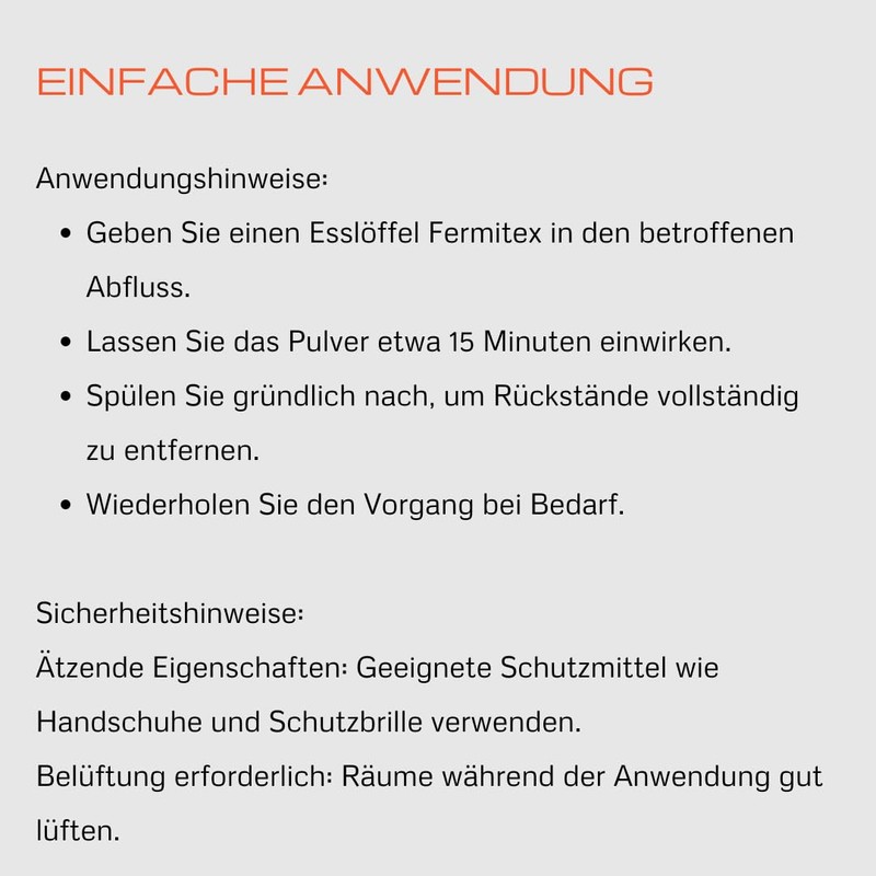 With Fermitex, the chemical pipe cleaner from Fermit GmbH, you can eliminate blockages in drains quickly, efficiently and reliably. This highly effective cleaning powder is the ideal solution for spout, washing, toilet and urinary bowls. It not only fights blockages, but also eliminates bad odours and dangerous bacteria.