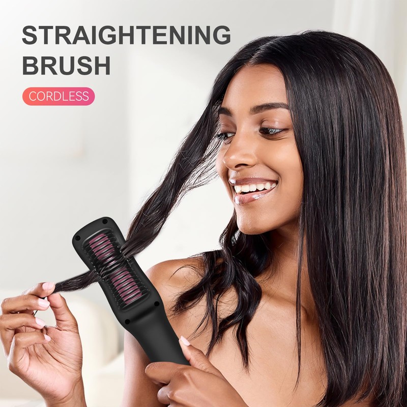 - CORDLESS & PORTABLE DESIGN: Enjoy the freedom of styling your hair anywhere without the hassle of tangled cords. This cordless hair straightener brush features a compact, lightweight design and a 3D denser teeth layout that straightens hair from root to tip while minimizing heat damage. The anti-scald U-shape flame-retardant plastic ring ensures safe, worry-free styling.