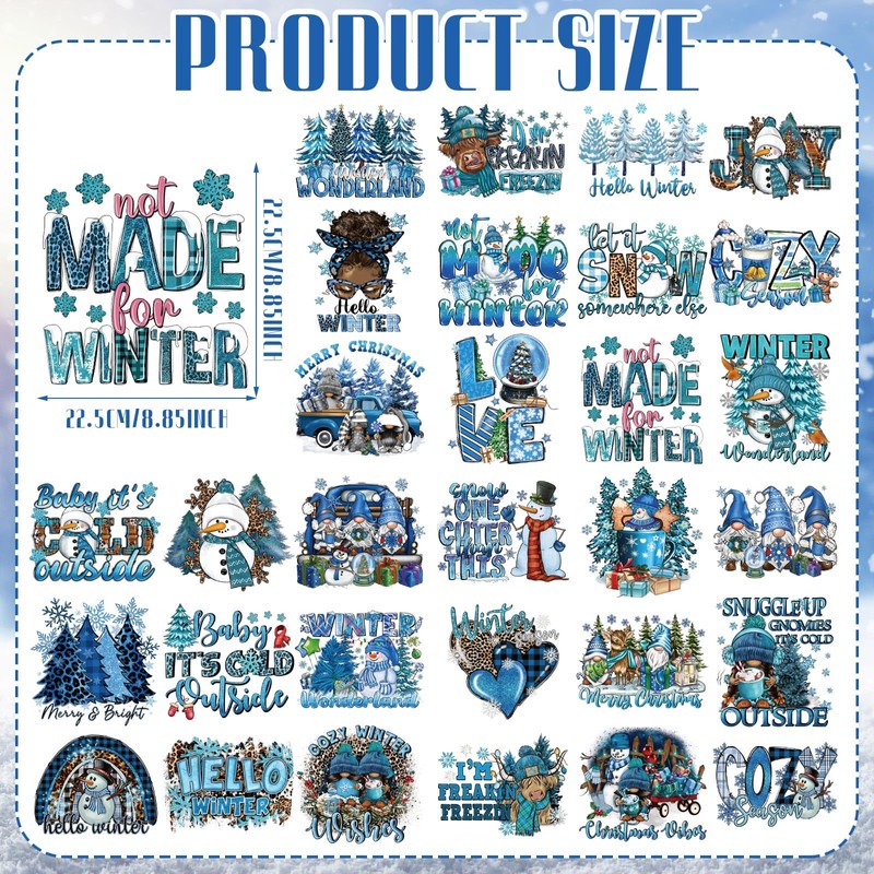 Ferraycle 30 Pcs Christmas Iron on Transfers for T Shirts Winter Snow Heat Transfer Blue Ready to Press Decals Stickers Patches Design for Clothing DIY Craft Decoration(Wonderland Theme)