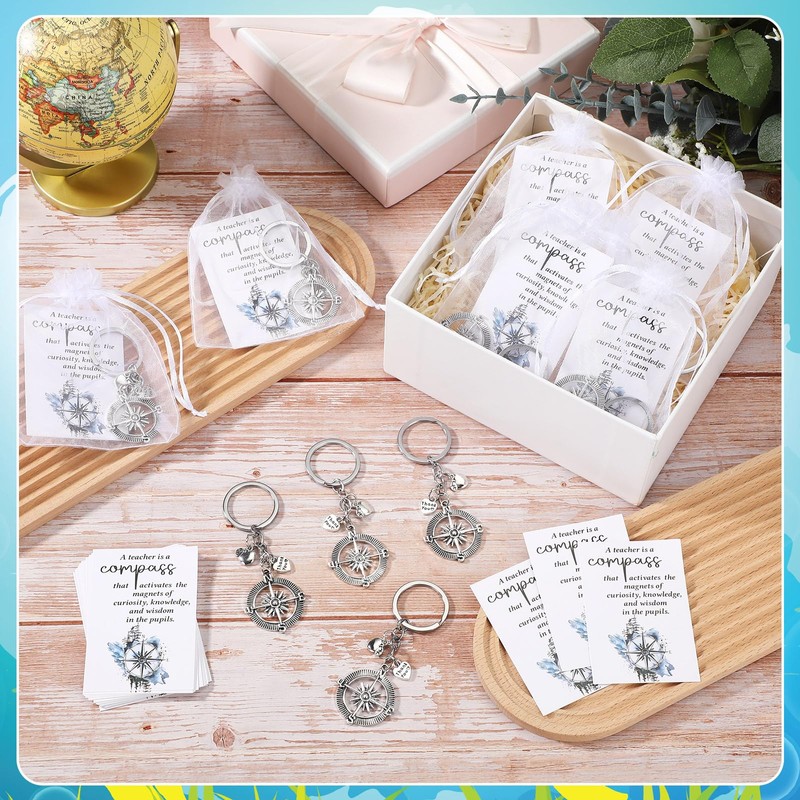 Ferreve 10 Set Christmas Gifts for Teachers Bulk Compass Keychain Teacher Appreciation Keychain with Thank You Cards Organza Bags