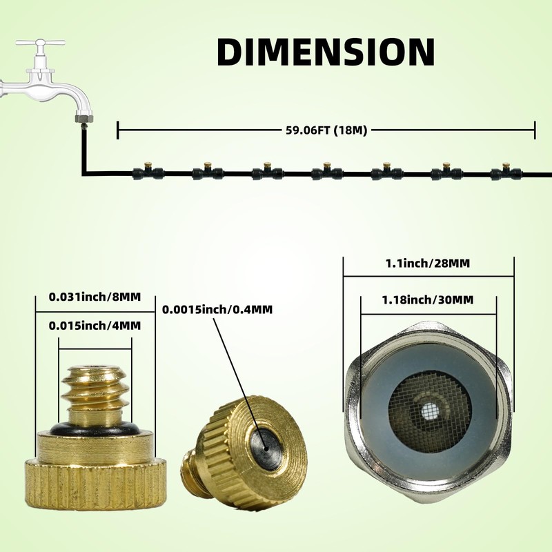 - Complete Accessories: This misting system comes with all the necessary accessories- a 59-foot PE pipe, a 3/4" connector, 15 brass nozzles and heads, 15 zip ties, 15 hose clamps, 1 cutter, 1 roll of Teflon tape, and 1 plug. No additional tools are needed