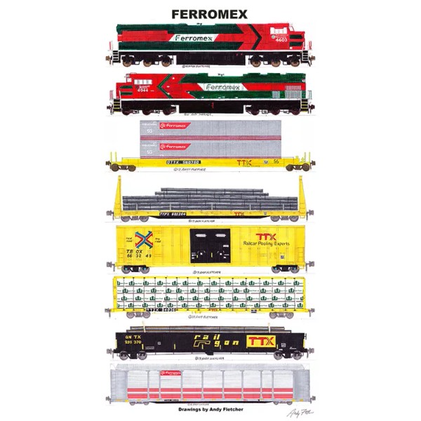 Ferromex TTX Freight Train 11"x17" poster by Andy Fletcher.  Poster is a signed print of a Ferromex TTX Freight Train drawn by artist Andy Fletcher, designer of the Norfolk Southern Heritage Locomotives.