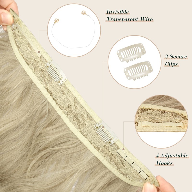 FESHFEN Invisible Wire Hair Extensions with Transparent Wire Adjustable Size Synthetic Hair Piece Long Wavy Secret Hairpieces for Women, Ash Blonde 20 inch