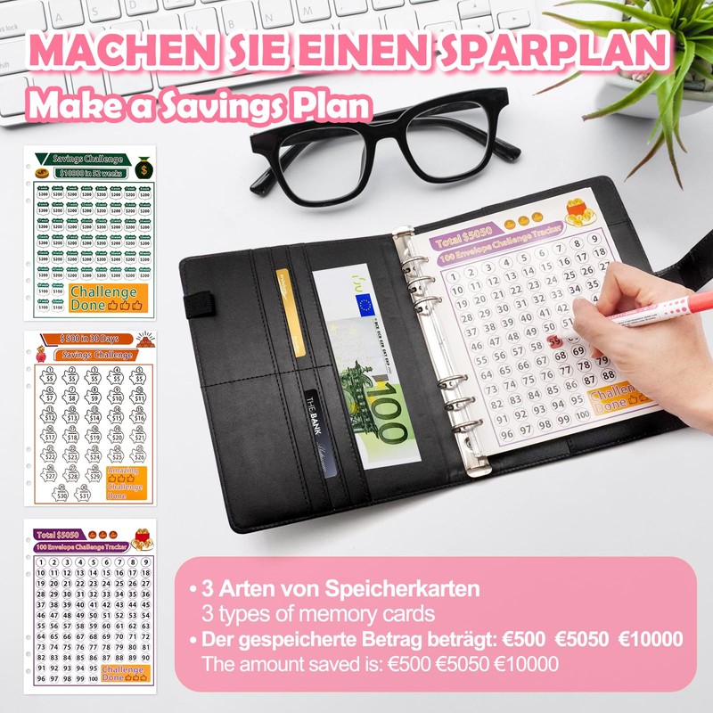 With 3 different types of challenge tracking cards, you can make your savings challenges more targeted and challenging! The storage amounts are: €500, €5050, €10000.
