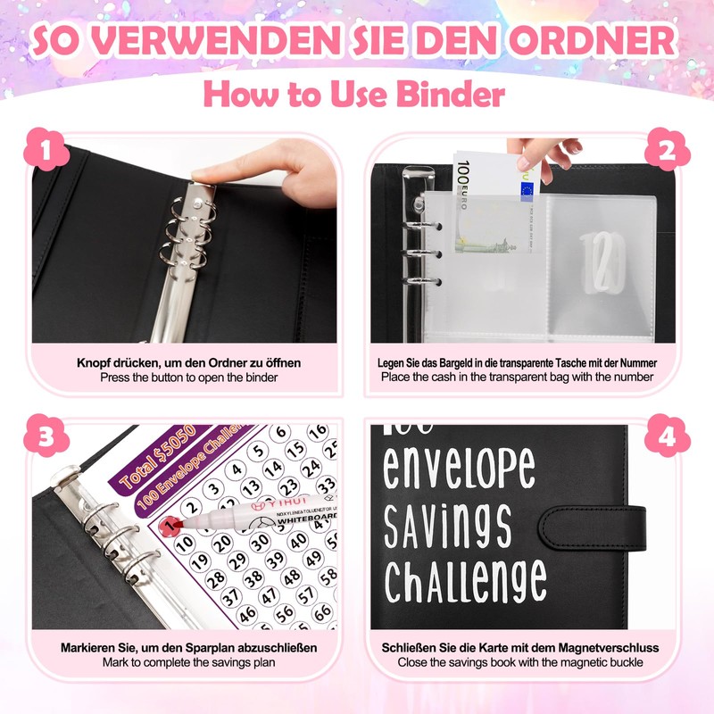 - 【Savings Challenge Book】: Our savings book is a PU leather A5 folder, equipped with 25 four-grid card films, 3 different savings challenge index cards and 1 watercolour pen. The 100 envelope compartments allow you to save 100 days of money by depositing the appropriate amount every day and holding it down with index cards.