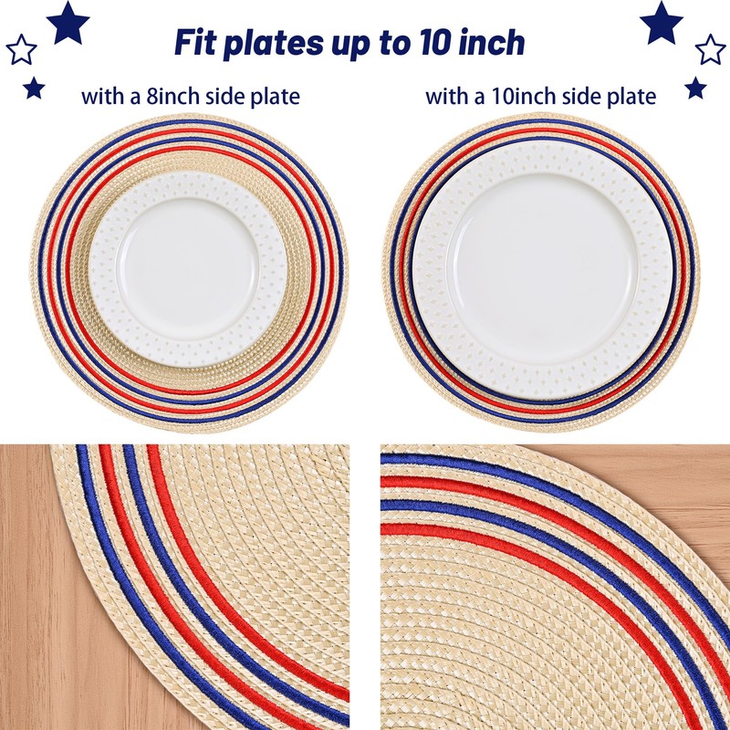 - Package: A set of 4 round Independence Day placemats, each with a diameter of 13.5 inches, and they are shipped in a flat state. These placemats with red and blue circle patterns are perfect for Independence Day parties, family gatherings, and daily use.