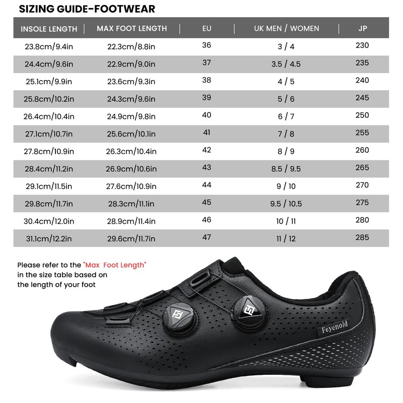 - Packaging and sizing: includes a pair of 6 degree cleats; Feyenold cycling shoes come in original packaging; we focus on the design and production of high-quality cycling shoes; please measure your foot length and consult our size chart to choose the right size