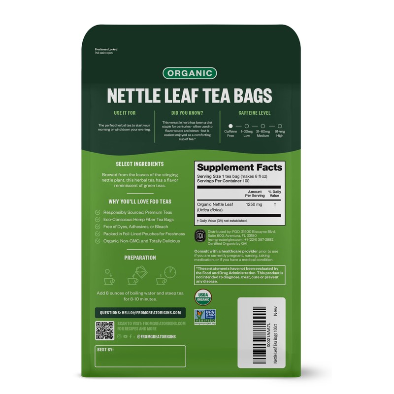 FGO Organic Nettle Leaf Tea, 100 Count, Eco-Conscious Tea Bags, Caffeine Free, Resealable Bag, Packaging May Vary (Pack of 1)