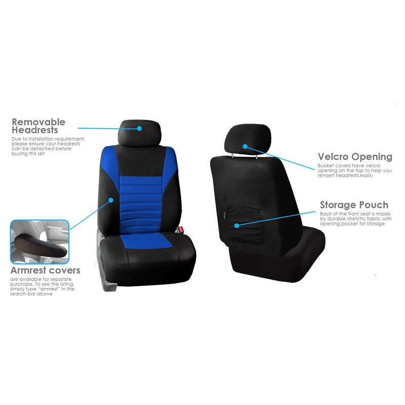 • Package Includes: 2 front bucket covers, 1 rear backrest cover, 1 rear bottom bench cover, 5 headrest covers, and 1 bag of snaps.