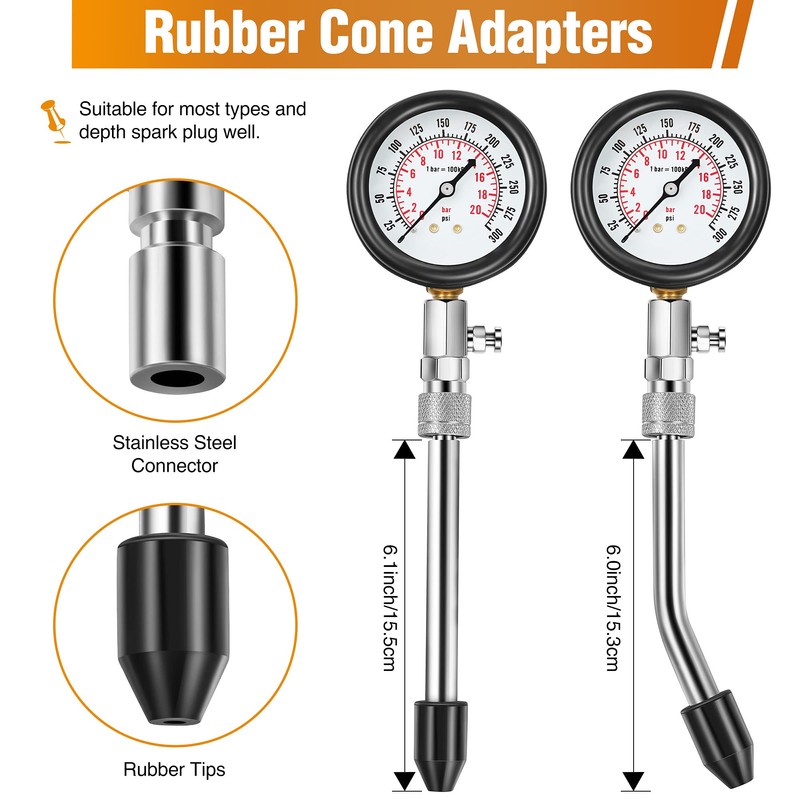- 【Complete Kit for Car Testing】: the 9pcs cylinder testing kit comes with 8 x compression tool and 1 x spark plug tester, total package includes 1 x SPARK PLUG TESTER, 1 x 300PSI DUAL UNITS GAUGE, 1 x STRAIGHT RUBBER CONE ADAPTER, 1 x CURVED RUBBER CONE ADAPTER, 4 x BRASS ADAPTERS, and 1 x 14-inch EXTENSION HOSE, complete package allows you to test the car’s condition easily by yourself