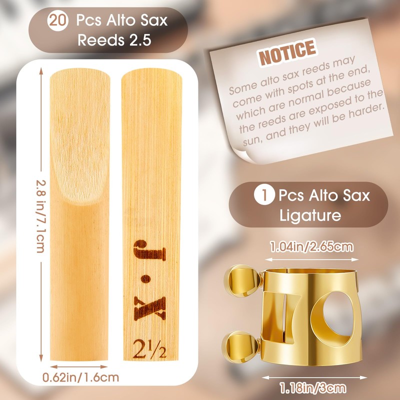 - Complete Package: the package comes with 1 alto sax ligature with adjustable screws and 20 strength 2.5 alto saxophone reeds (Mouthpiece not included), providing musicians with things they need for their alto saxophones; This helps users save their time and energy and make replacement easier