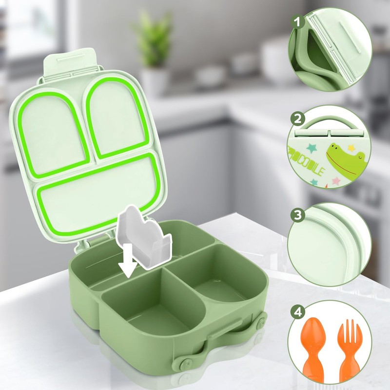 Fiambrera Bento Box para niños, Fiambrera para niños a prueba de fugas con 4 compartimentos, sin BPA, apta para lavavajillas, 1400ml Fiambrera con cubiertos para picnics, colegios (1, Verde)