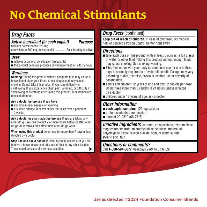 Since 1987, people have chosen FiberCon as the simple, safe, and comfortable fiber therapy option to help relieve constipation. FiberCon is just as effective as fiber powders for regaining bowel irregularity but provides a more convenient choice in easy-to-swallow coated caplets. FiberCon is 100% insoluble fiber that provides constipation relief by simply drawing water into the stool. FiberCon is safe and effective for adults and children 12 years or older and generally produces a bowel movement in 12-72 hours, and since the insoluble fiber in FiberCon does not ferment it will not cause uncomfortable intestinal gas or bloating. Trust FiberCon as your convenient and comfortable option to relieve occasional constipation and feel like yourself again!