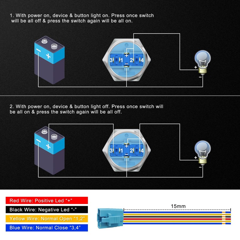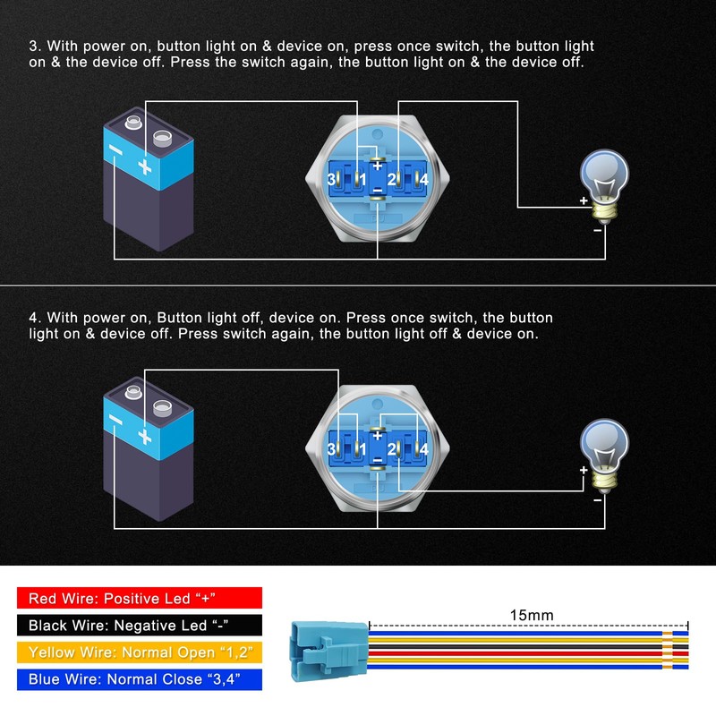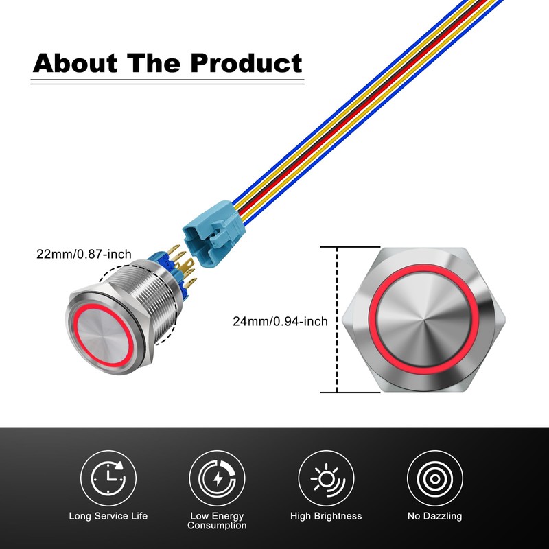 • Long Service Life & Package included: Electrical Life: 50,000 times. Mechanical Life: 200,000 times. Package included: 2 x 22mm Latching Push Button Switch, 2 x Wire Socket Plug, 2 x Nut, 2 x Waterproof Gasket.
