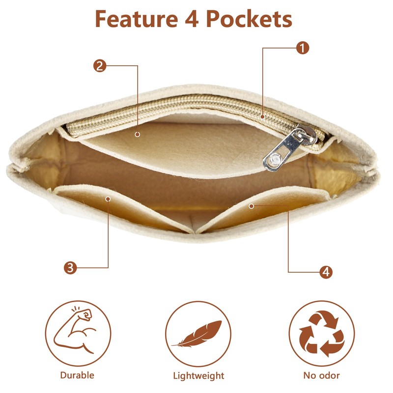 - Stay Organized On the Go: The felt organizer features 4 pockets(including a zippered compartment for valuables) to store makeup, phones, keys, and more. Dedicated bottle pocket fits water bottles/umbrellas
