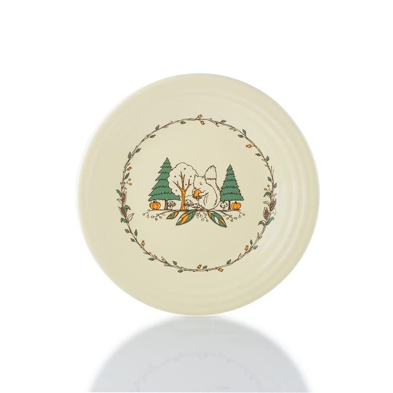 Grab a flannel blanket & come along on a hayride to explore the beautiful Everything Kitchens exclusive Fall Forest Collection! You will be surrounded in a crisp cool, autumn air where the leaves magically change colors before your eyes & curious little woodland creatures peek from behind the trees, pumpkins & cornfields to say hello. The Butterscotch & Meadow pattern featured on a traditional Fiesta 9" Round Luncheon Plate has a visiting squirrel enjoying a small acorn snack in the forest with a branch garland border entwined with corn, fall leaves & flowers. When you're looking for a plate that's a little bigger than an appetizer plate or salad plate but still smaller than a traditional dinner plate, the Fiesta 9" Luncheon Plate is the right "in-between" size. The 9" luncheon plate can be used for snacks, appetizers, desserts or to serve that perfectly toasted grilled cheese sandwich for lunch (with or without crusts & cut diagonally or into squares is totally up to you!). Proudly made in the USA, Fiesta protects its dinnerware pieces with a 5-year limited manufacturer's warranty against chipping under normal usage. The fully vitrified lead-free china won't absorb any odors or moisture & is resistant to cracking, chipping & fading. Along with being dishwasher safe, the 9" Luncheon Plate is both microwave safe & oven proof up to 350°F. Fiesta dinnerware pieces are durable enough for everyday use & can also be used as pieces of art to accent the kitchen, dining room or any other place in your home. Easily color coordinate an entire dinnerware collection with matching accessories or mix & match with +15 color options!