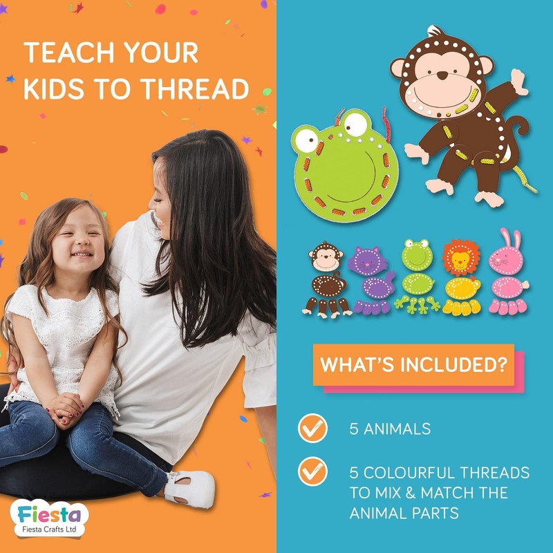 Fiesta Crafts Animal Lacing Cards - Bright Threading Toys for Kids to Improve Coordination, Motor, & Concentration Skills - Monkey, Cat, Frog, Lion, & Rabbit Pieces & 5 Different Coloured Laces
