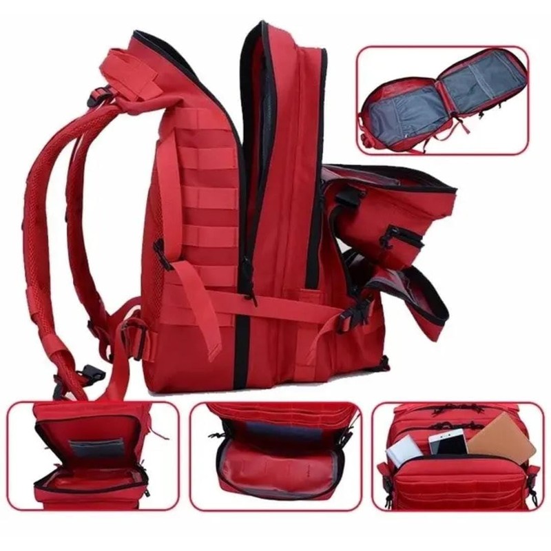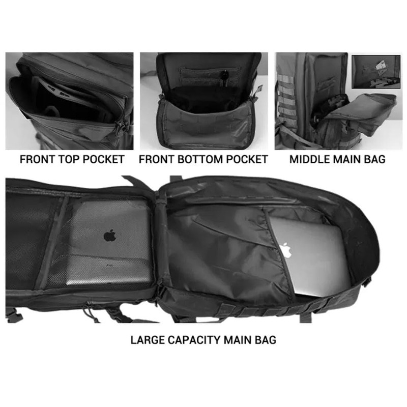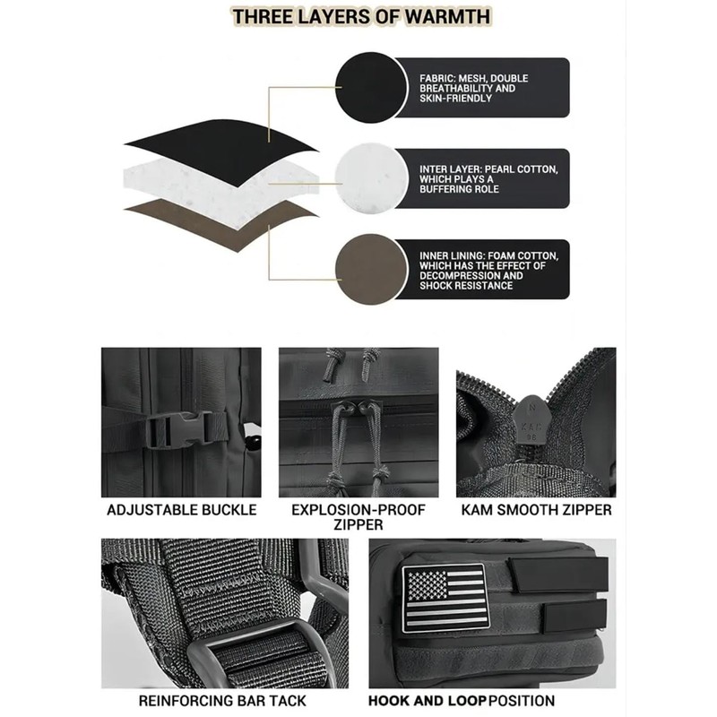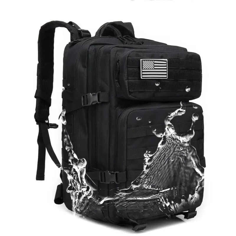 - Durable 900D Oxford Fabric – Water-resistant and rugged material built for tough environments. Spacious 45L Capacity – Multiple compartments for organizing gear, tools, or travel essentials. MOLLE System Ready – Attach pouches or gear using webbing on the front and sides. Comfortable to Wear – Padded straps, breathable mesh back, and chest strap for all-day support. USA Flag Patch Included – Removable Velcro patch adds a patriotic touch.