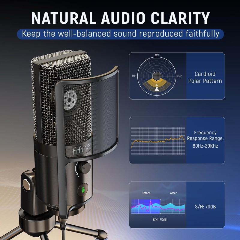 - [Rich, Balanced Audio] Unleash the full range of your voice via the podcast microphone with wide response frequency of 80Hz-20kHz. From deep bass to airy highs, studio microphone for PC faithfully reproduces nuance, delivering full-bodied audio output for your vocal. With a signal-to-noise ratio of up to 70dB, background hum and creaking noises fade into the background, leaving your voice crisp and clear.