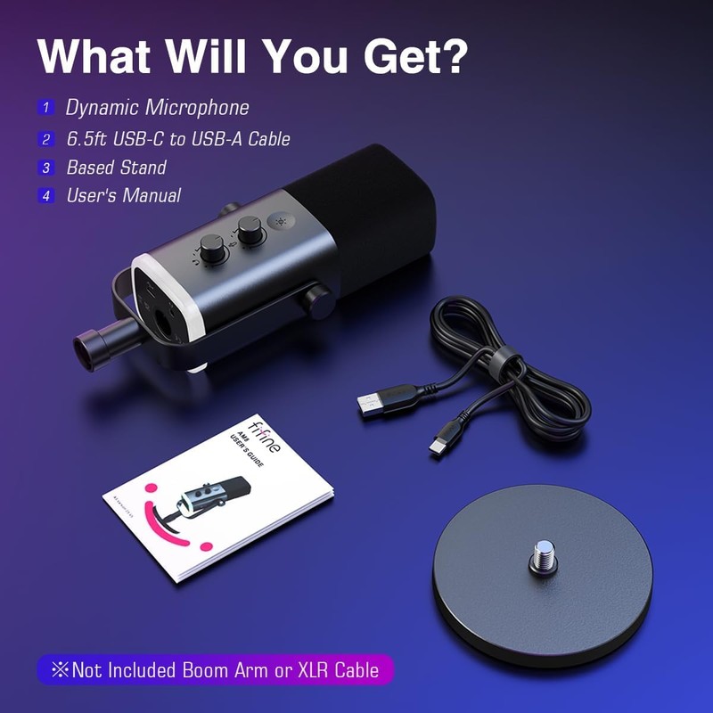 • [Included Accessory Package] - 1 x Dynamic Microphone with Windscreen, 1 x 6.5ft (2m) USB-C to USB-A Cable, 1 x Mic Based Stand, 1 x User's Manual (Tips: XLR cable and mic boom arm are NOT included)