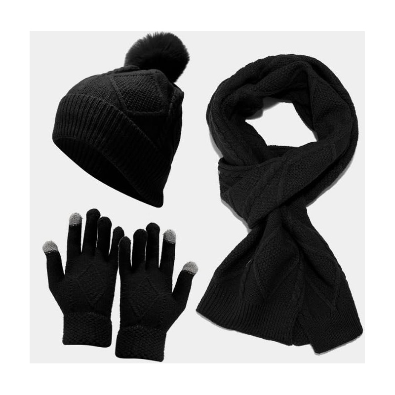 Figarge Women's Winter Hat Scarf Touchscreen Gloves Set with Thick Fleece Lined 3-in-1 Thermal Winter Hat Knitted Hat Beanie with Bobble Scarves and Touchscreen Gloves for Outdoor Sports, black