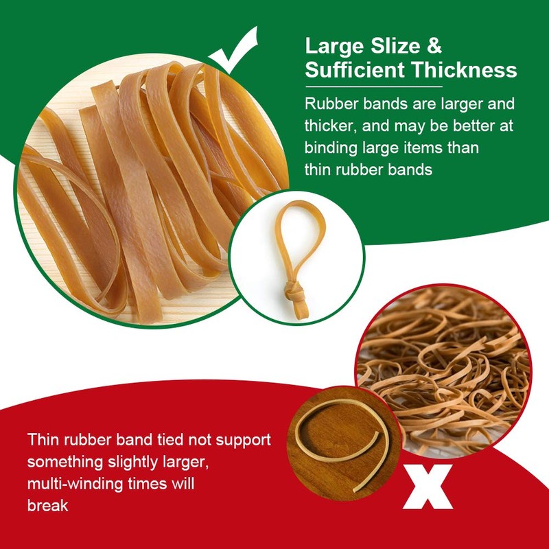 - High-quality natural rubber material: the elastic rubber bands are made of natural rubber with reliable strength and reusable comfort, high temperature resistance, ageing resistance and toughness. As they can be used repeatedly, they are an excellent environmentally friendly alternative to hemp ropes and box tying ropes.