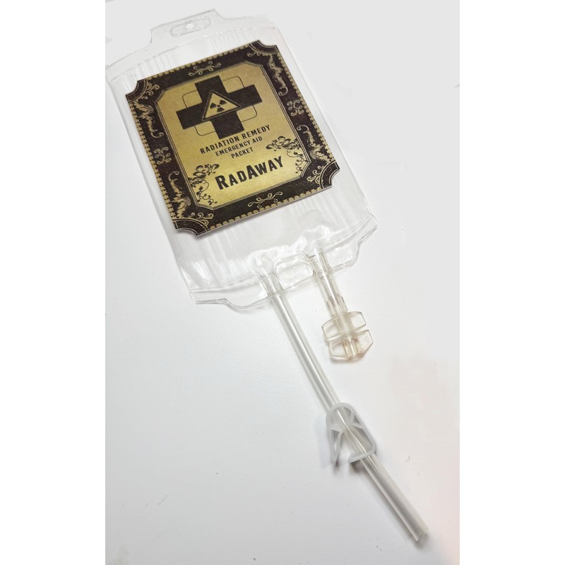 Add The Fallout 76 Rad Away Pack prop replica to your collection. Fill the pouch with any colour liquid you want. Use the clip provided to seal the tube. You will receive 1 pouch with metallic labels. They will be shipped empty, no liquid. Pouch mesures: 7x4 inches