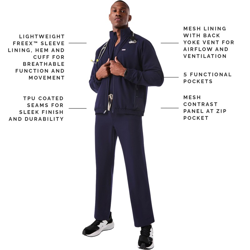 - STYLISH AND PROFESSIONAL LOOK — These medical scrub jackets for men are designed with a stylish mesh lining with back yoke vent for airflow and ventilation, mesh contrast panel at zip pocket, and TPU coated seams for a sleek finish and durability. The sleeve lining, hem, and cuff use lightweight FREEx fabric for breathable function and movement. The FIGS Cobaki will have you looking stylish and professional without sacrificing comfort and function.