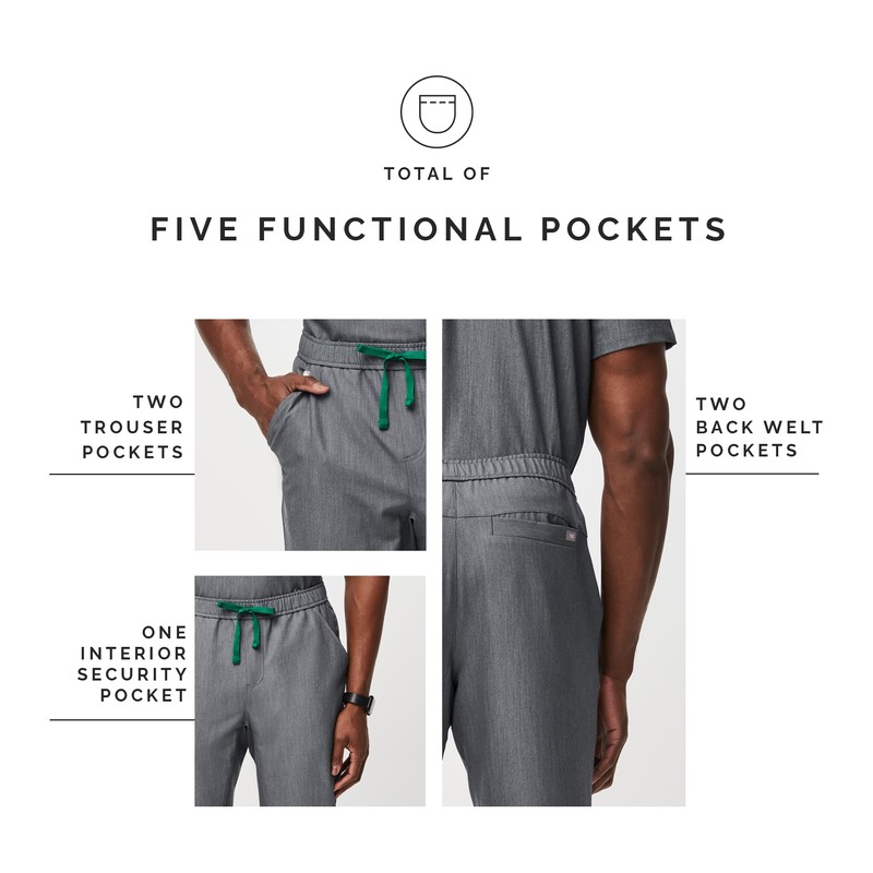 - SMART STORAGE FUNCTIONALITY — FIGS Tansen men’s joggers let you keep everything you need within arm's reach with 5 pockets: two trouser pockets, two back welt pockets, and one interior security pocket. The perfect places to hold your pens, notepad, gum, and other essentials.