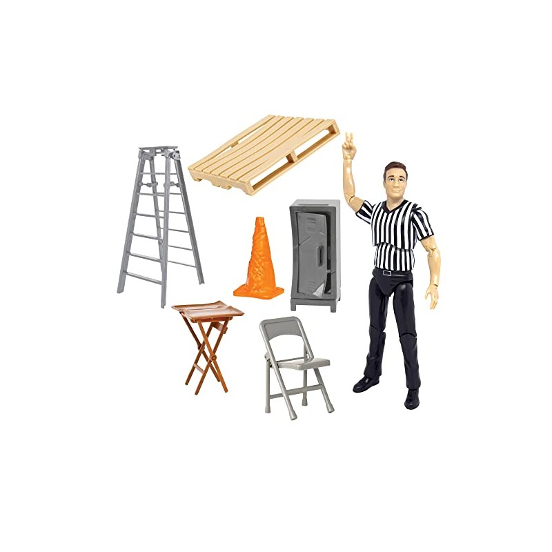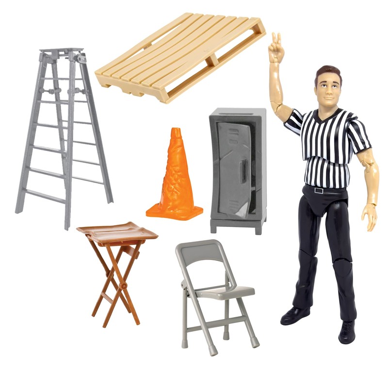- Includes deluxe articulation referee action figure, pallet, folding chair, traffic cone, TV tray, ladder & locker