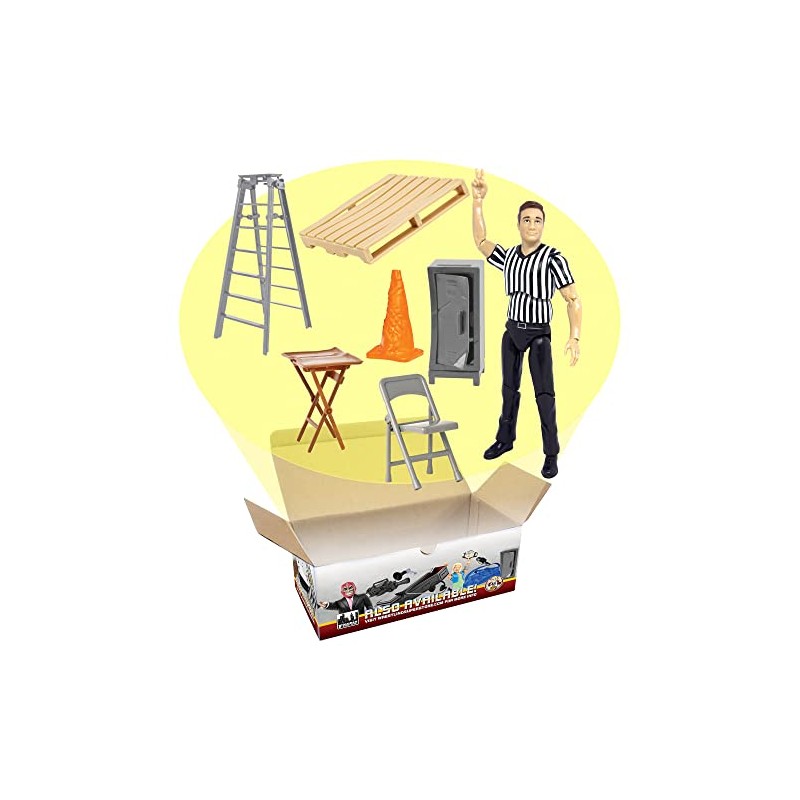- Includes Referee figure Action Figure, Pallet, Folding Chair, Traffic Cone, Locker, Barricade and Towel!