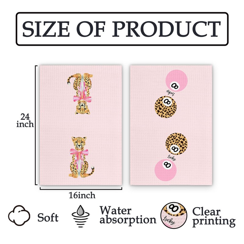 FIicy Pink Leopard Decor Hand Towels Set of 2 - Trendy Pink Preppy Leopard 8 Ball Kitchen Towels, Coquette Bow Cheetah Decor Hand Towel for Bathroom Kitchen, Preppy Coquette Bathroom Decor(16x24Inch)