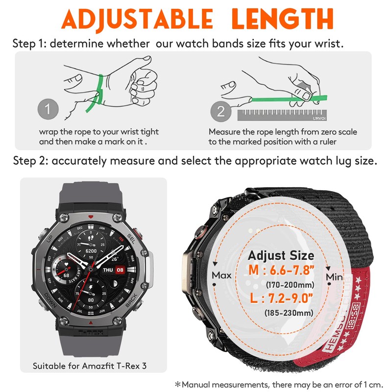 - Sporty and Stylish Design Watch Bands - Crafted from durable nylon, this T-Rex 3 band is built to withstand hiking,fishing,golf,campingand intense workouts. Its lightweight, breathable design keeps you cool, while the adjustable hook and loop closure ensures a secure fit for running, cycling, and more.