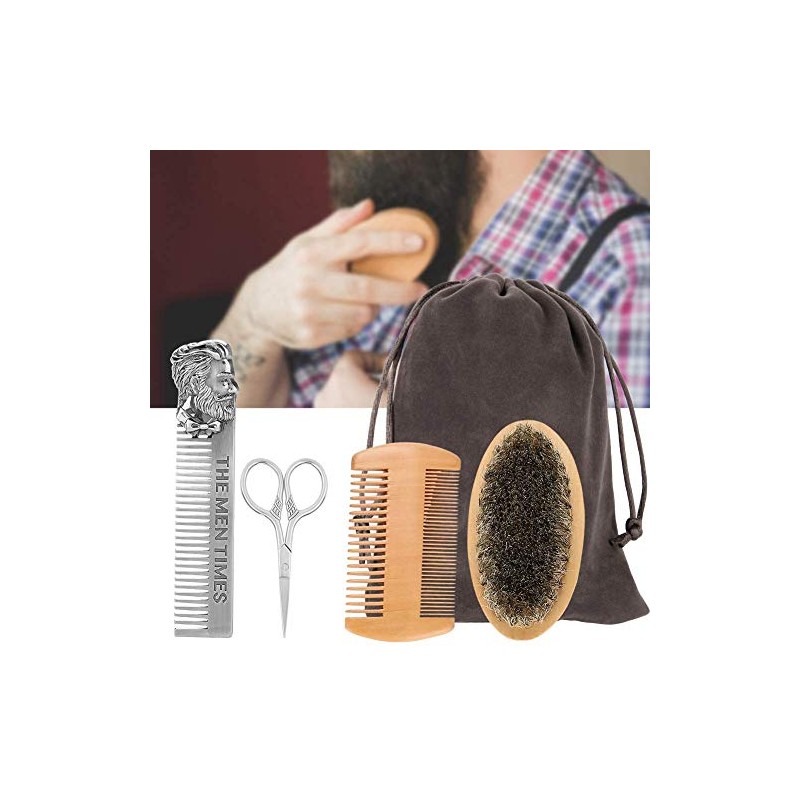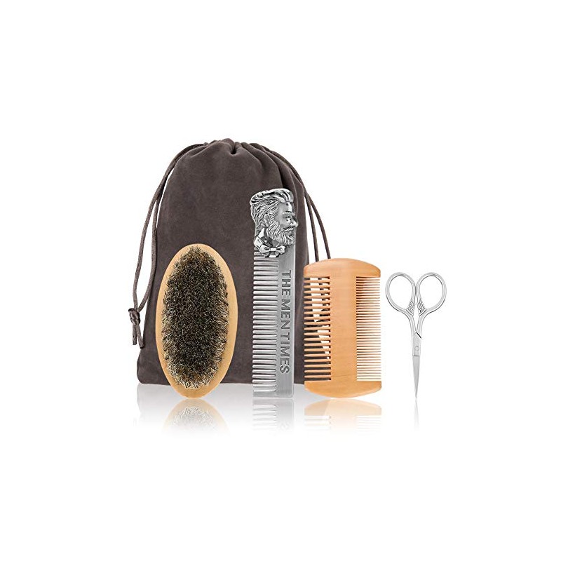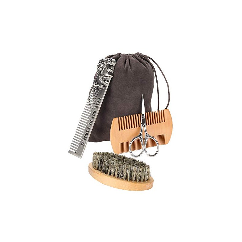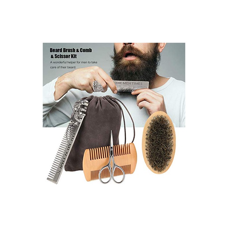 Filfeel Set de cepillo para barba 4pcs, Cepillo de barba para hombre y juego de peine de barba con peine de acero inoxidable, tijeras, peine largo, Profesional solo para hombres,