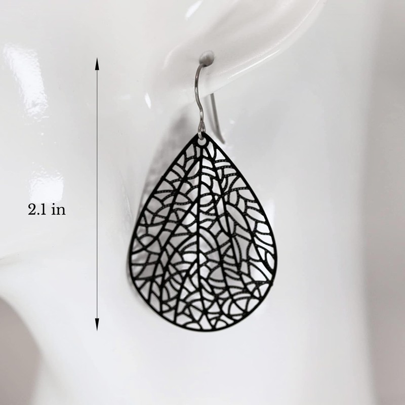 Filigree Dangle Earrings, Lightweight Teardrop Cutout on Hypoallergenic Pure Titanium Hooks (Black)