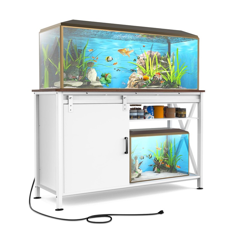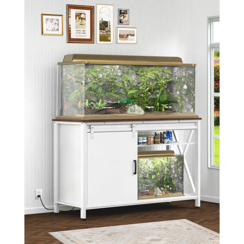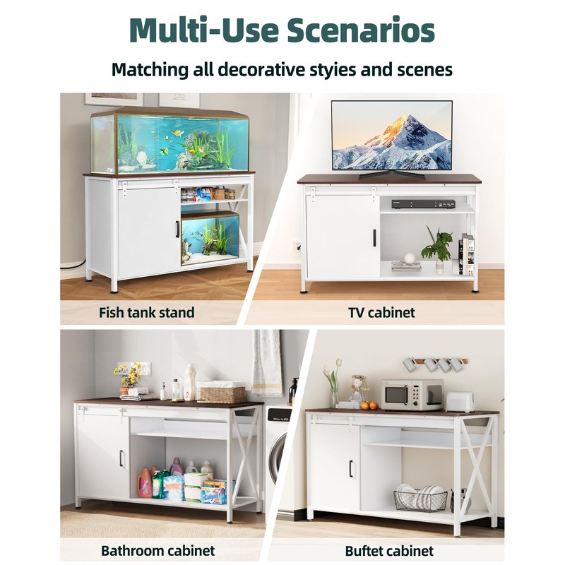 - Stylish & Modern Style : White metal frame fish tank stand is paired with farmhouse-style sliding barn doors and MDF wood grain texture tabletop, making fish tank with stand suitable for any modern, industrial, or rustic decor; Ideal for fish tanks, turtle enclosures, or reptile terrariums in the living room, bedroom, or office
