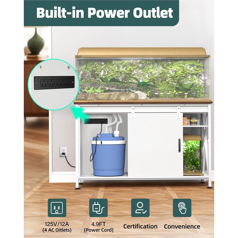 - Safe Built-In Power Outlets: 55 gallon fish tank stand has a built-in power outlet to prevent water contact and ensure safety; Easily connect electronic devices such as lights, heaters and pumps without the hassle of additional extension cords; The 6" slot on the back of the fish tank stands allow for facilitates pipe connections and better cabinet ventilation to reduce moisture