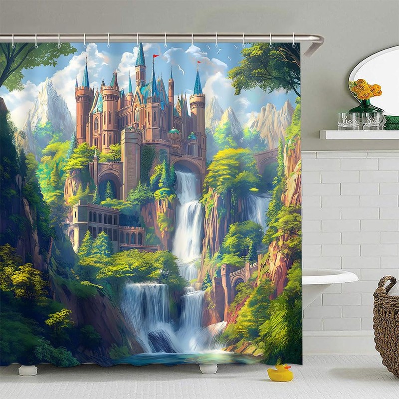 FILMILIL Green Forest Waterfall Castle Shower Curtain Fantasy Jungle Wonderland Mountain Magic Fairy Tale World Rainforest Natural Landscape Bathroom Curtain Set Polyester Fabric Hooks 70 X 70 Inch
