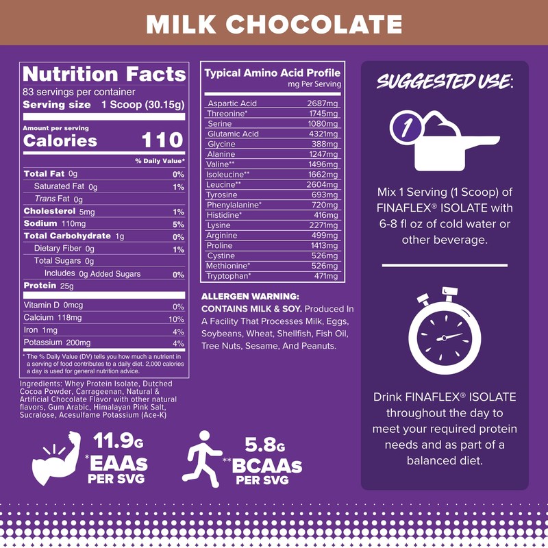 - LOW-CARB PROTEIN - FINAFLEX ISOLATE delivers 25 grams of high-quality Iso Protein in every scoop. It has zero sugar, zero fat, plus only 110 calories and one carb per serving.