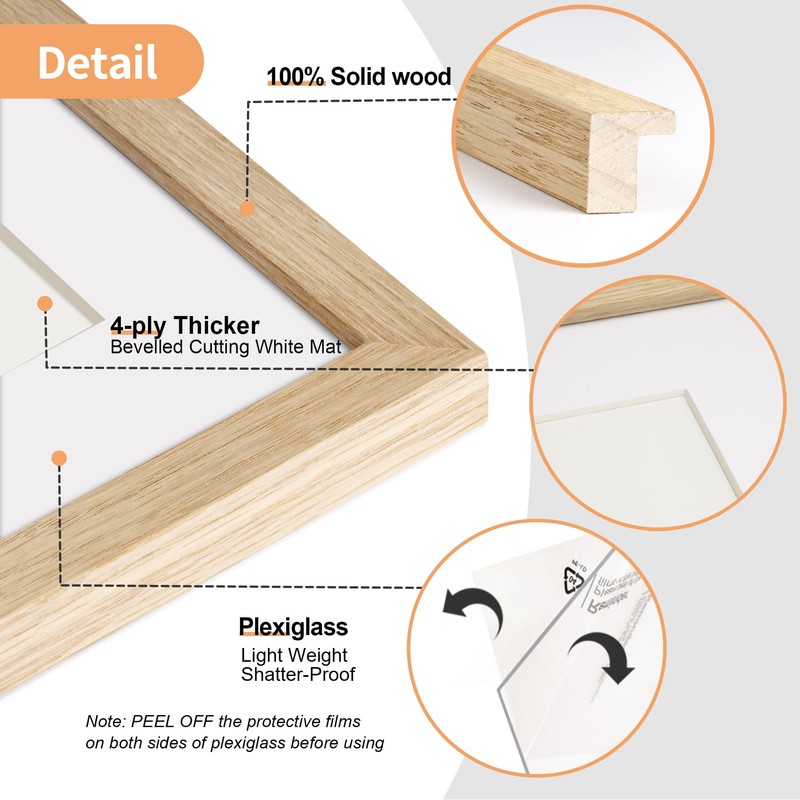 - Material: These 16x20 frames Crafted from solid oak wood for long-lasting durability and a premium look, using anti-shatter plexiglass front and 4 ply acid-free white mat to make the frames lightweight and security, keep your precious pictures clear and last for years. And the durable metal hangers make the wall mounting more safer. Please PEEL OFF the protective films on both sides of plexiglass before using.