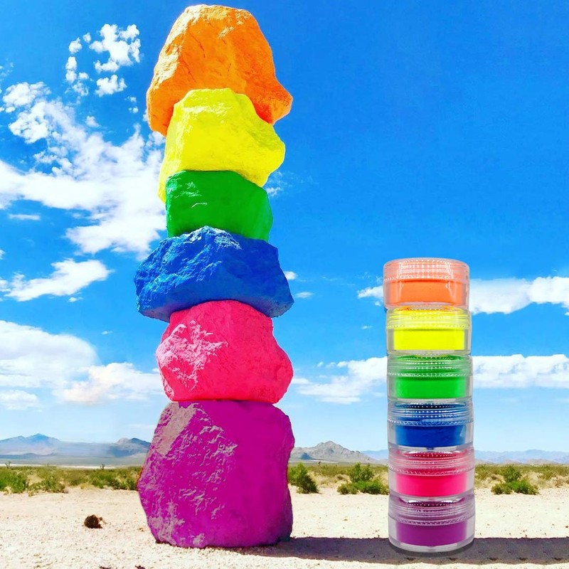 - 6 bright colors Neon Rainbow eyeshadow powder. Highly pigmented eyeshadow shades with 6 super vibrant eye shadows: rose red,orange,yellow,green,blue,purple, you can create super fun summer looks with this compact eyeshadow set.