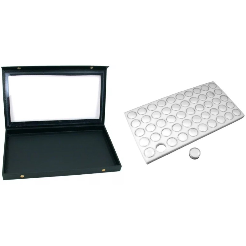 - This is a new black faux leather display tray with an acrylic snap close lid