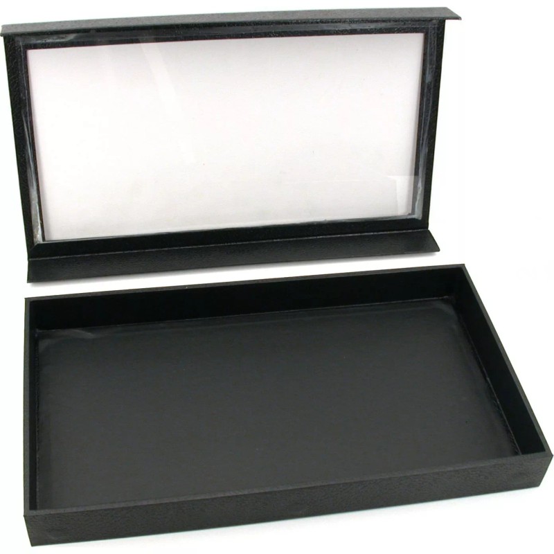 - This is a new black faux leather display tray with an acrylic snap close lid
