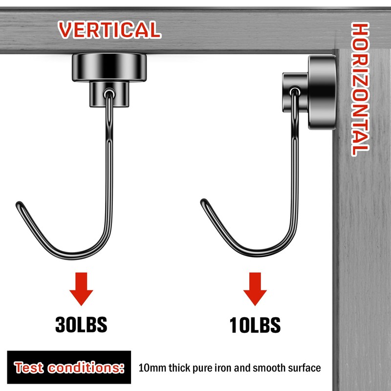 - Large Suction Each magnetic hook could hold 30 pounds. The capacity of 30pound is based on vertical application, it will reduce by 2/3 if used horizontally.