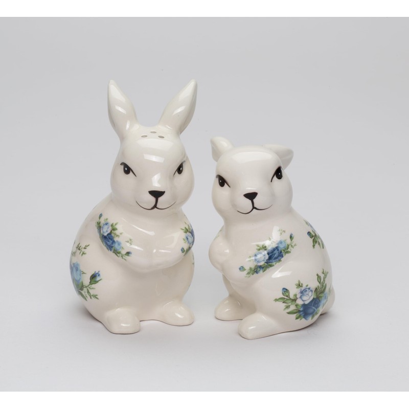 Fine Ceramic Easter Bunny Rabbit with Blue Roses Salt & Pepper Shakers Set, 3" H