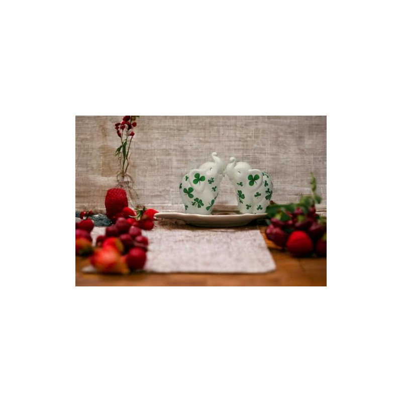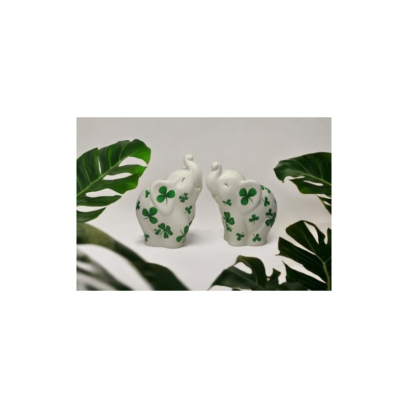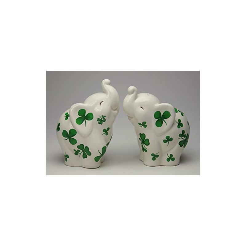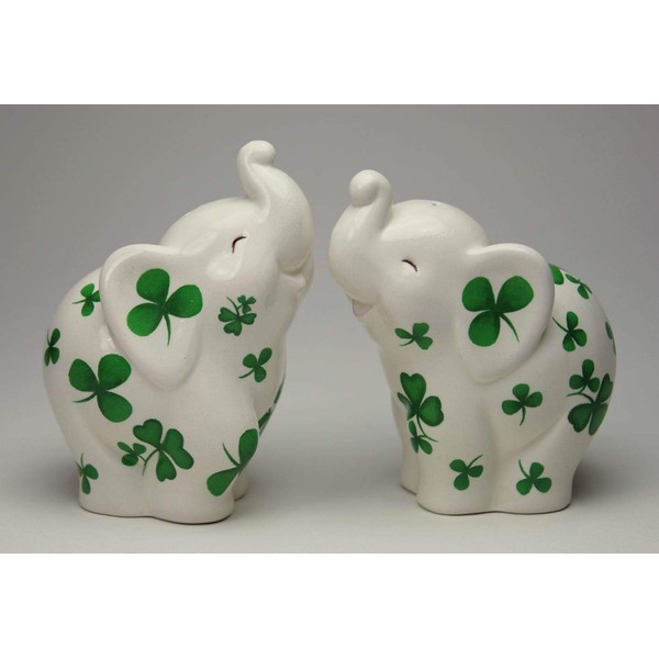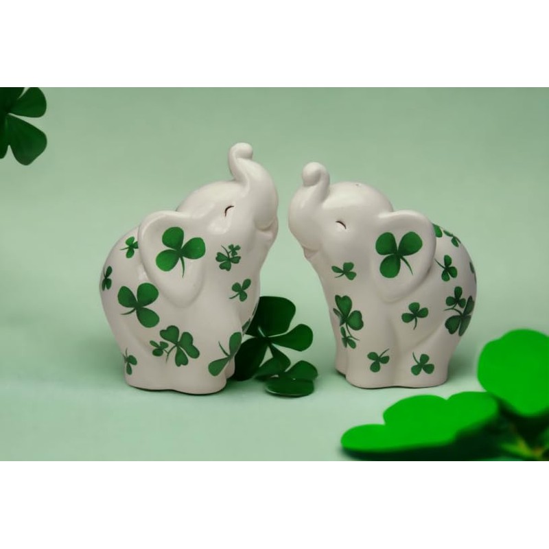 Fine Ceramic Shamrock Prints Design Lucky Trunk Up Elephant Salt & Pepper Shakers Set, 3-1/2" H