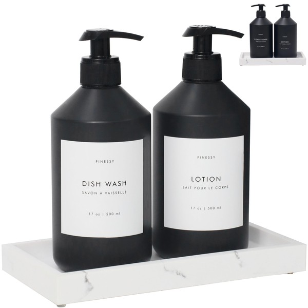 - LUXURIOUS BATHROOM OR KITCHEN UPGRADE: This black hand soap and lotion dispenser set with tray includes a sophisticated black tray, two durable 17oz (500ml) black plastic bottles, 12 stylish waterproof labels, and a handy collapsible funnel. It's the perfect addition to elevate any kitchen or bathroom decor.