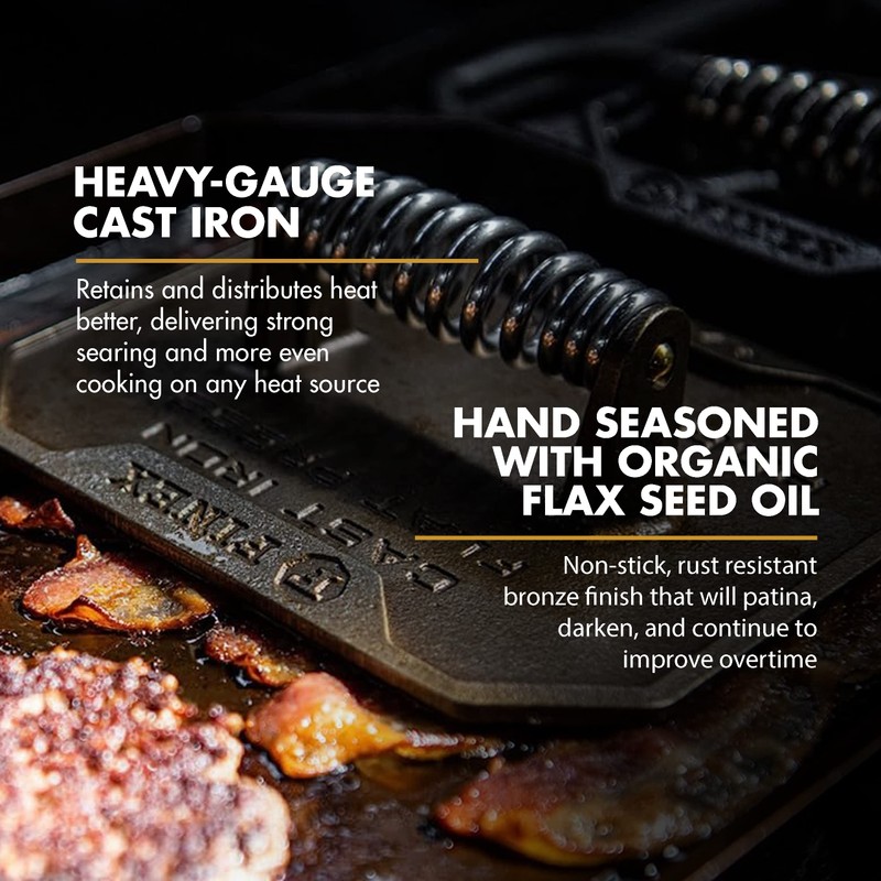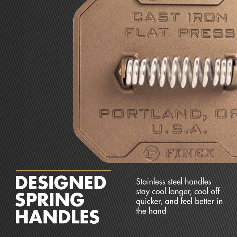 The handle of this cast iron bacon press is not just great to look at but is also very functional. Wound from 300 series stainless steel rod stock and hand-polished to a high luster, our handles stay cool longer, cool off quicker, and feel better in the hand. Pre-seasoned with 100% organic flaxseed oil, this non-stick flat press presents a rust-resistant bronze finish that will darken and continue to improve as you cook. Its smooth cooking surface is CNC machined for near non-stick performance and easy cleanup. Enjoy a fun, approachable, and friendly cooking experience with this cast iron press for burgers, bacon, and more.