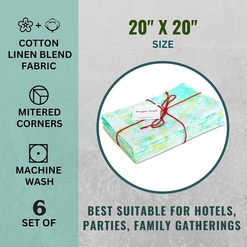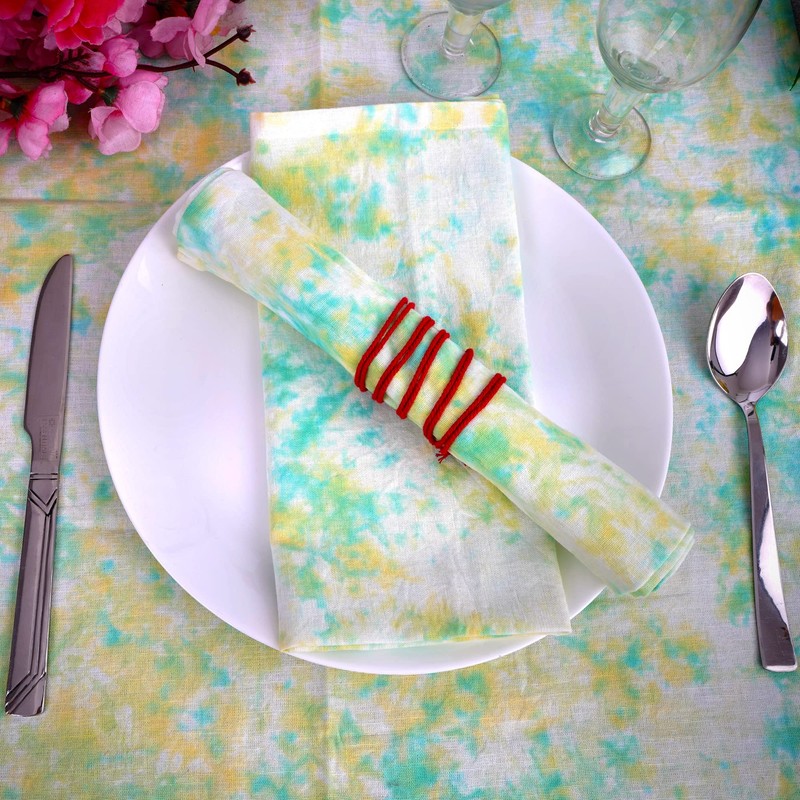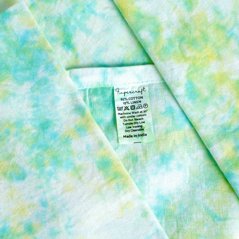 - DESIGN STORY - This warm and vivid dinner cloth napkin is giving the impression of the green lush meadow with dazzling sunshine and dense sky. The crumple tie & dye technique giving it a distinct and intriguing effect. This soft and absorbent Fingercraft cotton-linen tie & dye napkin in yellow, green, white and blue will add lively and joyful vibes when placed on the dining table.